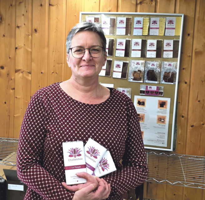Enfant de Chexbres, Christine Chollet vit aujourd’hui à Forel, aux côtés de son époux Rémy, qui se partage entre ses métiers d’agriculteur et d’employé communal. C’est dans un coin de la belle ferme familiale, là où elle a vu grandir ses deux enfants désormais adultes, que cette étonnante artisane chocolatière a installé son laboratoire. Et c’est dans cet univers gourmand qu’elle façonne à la main, au gré de sa fantaisie, des chocolats artisanaux, des pâtisseries maison, des créations sur mesure pour les particuliers et les entreprises. Régulièrement, elle organise des dégustations et des ateliers à thèmes pour petits et grands.
