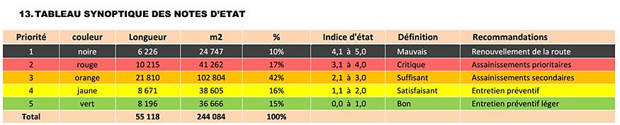 • Le tableau ci-dessous montre l’état de dégradation du réseau routier, l’indice d’état est la « note » attribuée aux tronçons auscultés (5 = mauvais, 1 = bon)