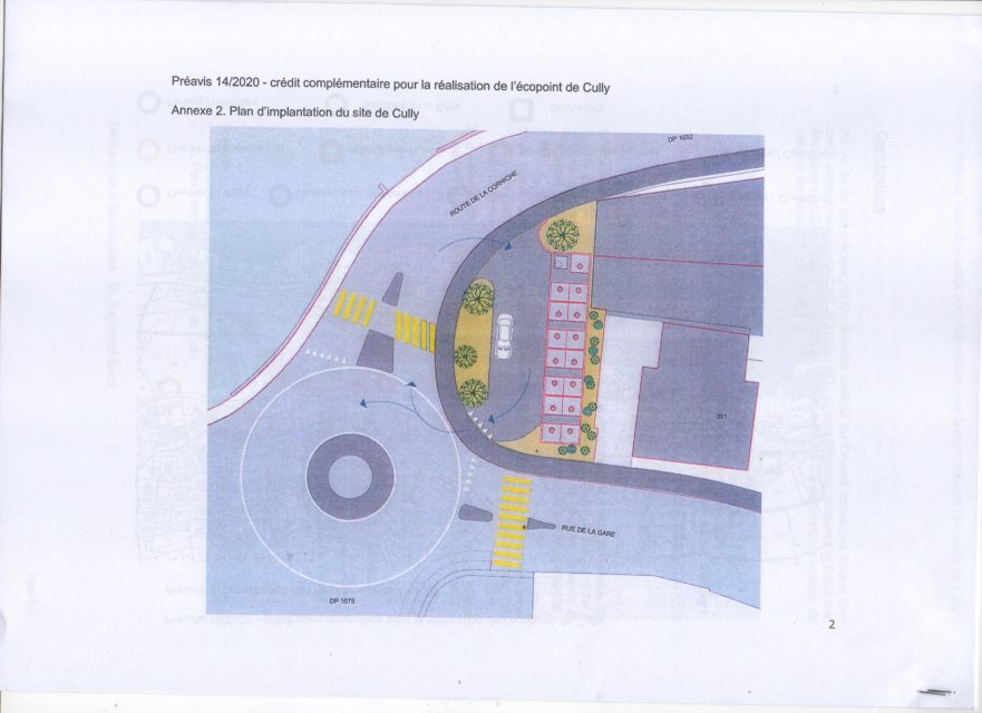 En 2016, le Conseil a octroyé un crédit d’investissement de Fr. 630’000 pour une implantation de huit éco-points. En 2018, c’est un crédit d’investissement complémentaire de Fr. 168’000 pour la réalisation de sept éco-points, celui de Cully devant faire l’objet d’une réévaluation. Une étude très fouillée a été menée par la Municipalité quant au choix de l’emplacement, en concertation avec les services cantonaux. L’emplacement choisi se trouve être à la route de la Corniche à Cully (rond-point de la gare). Tant la COFIN que la commission ad’hoc se sont ralliées aux conclusions du préavis municipal 14 / 2020. Quelques voix se sont élevées contre ce préavis, tout particulièrement en raison de son emplacement, des nuisances induites, des problèmes de circulation, allant jusqu’à proposer un renvoi à la Municipalité pour une nouvelle étude… Ces diverses remarques ont été balayées par le municipal Raymond Bech en charge des déchets. Au vote, le préavis accordant un crédit d’investissement complémentaire de Fr. 292’000 pour cette installation a été accepté par 35 voix, 14 contre et 6 abstentions. Ainsi le crédit total pour les huit éco-points s’élève à Fr. 1’090’000 hors taxes. La saga des éco-points aurait-elle trouvé son épilogue ?