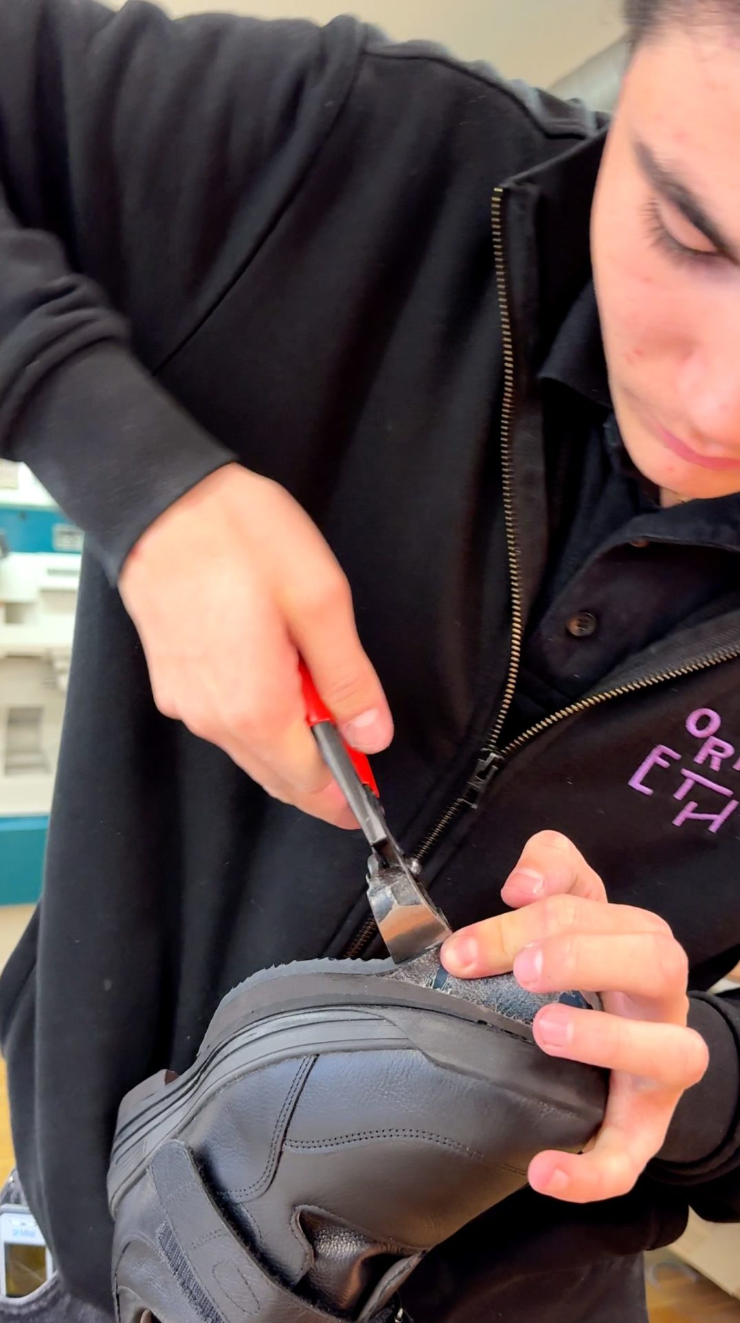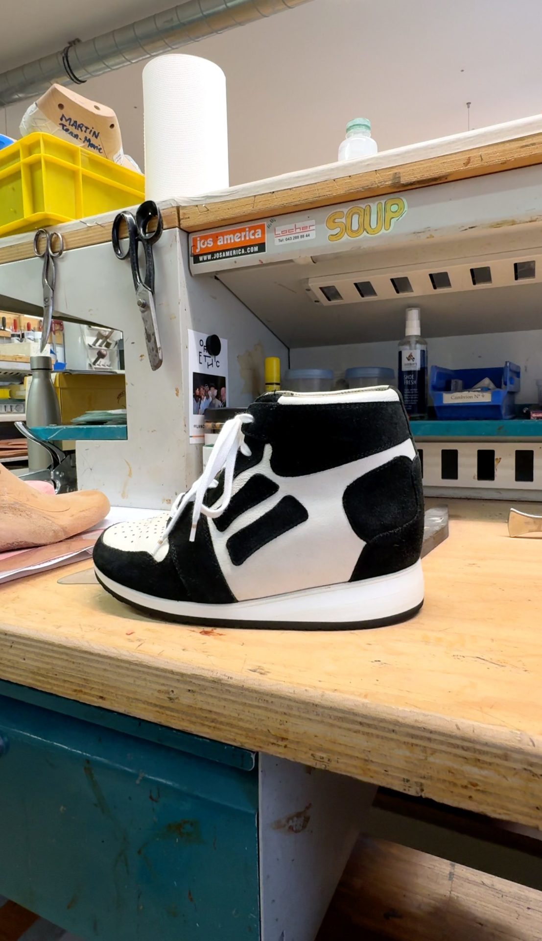 Texte et photos Sonia Biétry | Quand on découvre l’atelier où travaille Tiago Teixeira Loureiro ce qui frappe d’abord, ce ne sont pas les machines, mais la façon dont il parle des gens qui poussent la porte du magasin. Pour lui, ce ne sont pas des clients, ce sont des patients. Leurs pieds ne commandent pas une chaussure, ils racontent une histoire, faite de douleurs, de blessures anciennes, de démarches un peu hésitantes, nécessitant un soutien. Tiago a 17 ans et est en formation première année de CFC bottier-orthopédiste à Lausanne. Il se voit moins comme un fabricant d’objets/un designer, que comme un artisan du mouvement. Un soignant qui travaille avec ses mains et son écoute pour rendre la marche possible, fluide, presque oubliable.