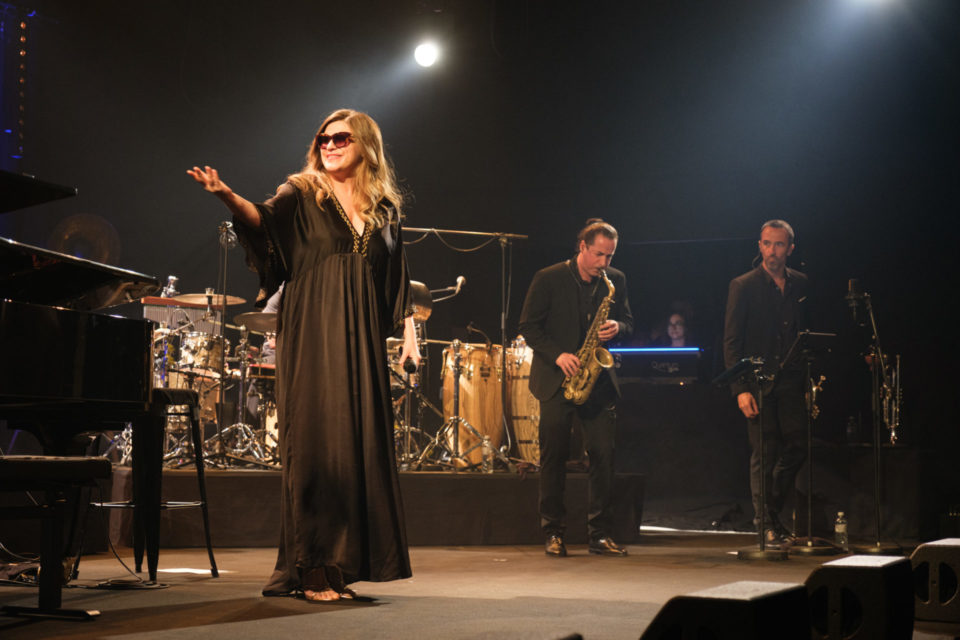 Les musiciens apparaissent progressivement. D’abord, le percussionniste pour un bref solo, puis le saxophoniste, le pianiste (Philippe Baden Powell) et enfin, Melody Gardot. Après deux premiers titres, sa voix se pose. La chanteuse prend le temps d’expliquer. Un peu de trac, confie-t-elle, et surtout cette surprise touchante : entendre le public l’appeler depuis les coulisses. « Cela nous a beaucoup touchés de vous savoir impatients depuis les backstages », dit-elle en français.