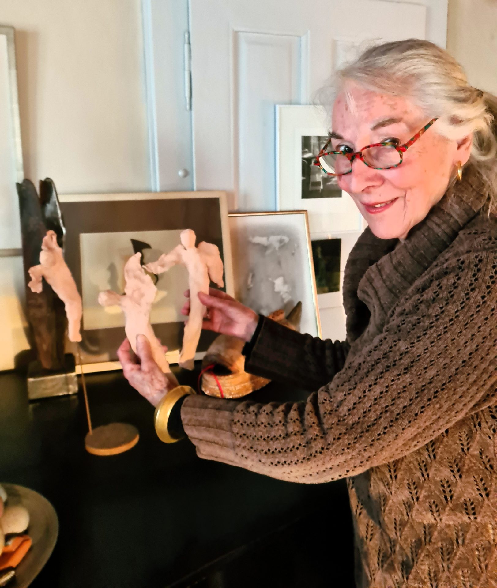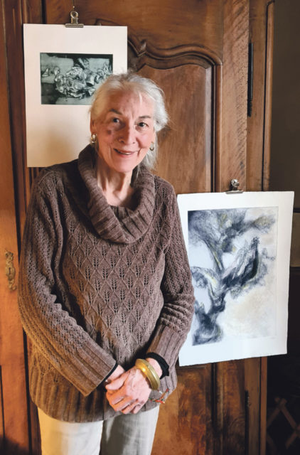 Avec une maman, qui s’adonnait à la peinture sur porcelaine, Claudine apprit dès sa petite enfance à utiliser des crayons. Très vite le besoin de s’exprimer par la peinture, le dessin, sont devenus indispensables. Réfractaire à l’école, elle trouve rapidement du travail pour financer ses projets artistiques en faisant de l’iconographie et des recherches en lien avec le patrimoine (Encyclopédie vaudoise). Son esprit curieux et ouvert et son envie de créer l’ont emmenée vers différentes disciplines telles que la peinture à l’huile, l’aquarelle, l’acrylique, les sculptures en fer, en terre cuite et la gravure. « Fabienne Vögeli m’a fait découvrir la gravure et subjuguée par le côté magique du résultat obtenu en intégrant des objets directement dans mes créations, en les encrant et les passant sous presse, j’ai pris des cours avec elle. Je ramassais tout ce qui m’inspirait, pressais, collais, teintais, dessinais, gravais : les trousseaux de ma mère, de ma grand-mère que j’avais hérités où je découpais les monogrammes, des bas, des racines, des graines, des plantes, des insectes, etc. J’ai ainsi réalisé de nombreuses œuvres, souvent des séries qui permettent d’approfondir un sujet. Laura Salvadori a choisi 30 pièces sur les 250 sélectionnées pour l’exposition » relate Claudine Hildbrand-Leyvraz qui, à 82 ans, reste hyperactive et passionnée par tout ce qui l’entoure. « Avec l’âge, on bouge moins mais on observe plus » révèle cette créatrice infatigable, qui a eu de nombreuses activités tout en travaillant à la maison pour élever ses 3 enfants, dont ses deux filles qui ont fait leurs chemins dans les arts visuels. Elle a également le bonheur d’être grand-maman de deux petits-enfants et de partager sa vie avec son mari, médecin à la retraite.