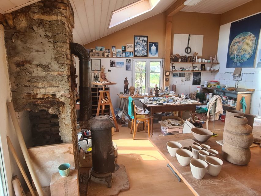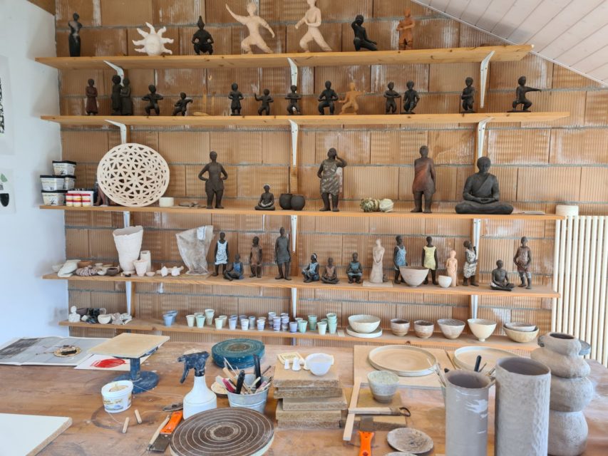 Alors qu’à l’extérieur, la bise se plaît à tout glacer sur son passage, je pénètre dans l’atelier de Marie Saurer, au cœur de Ferlens, où ronronne un petit poêle à bois, offrant une atmosphère chaleureuse. Une longue table trône au centre de ce bel espace lumineux, garnie de pots, de pinceaux, de bidons de terre et d’œuvres en cours. Sur les étagères et tout autour de nous, les regards d’une incroyable diversité de sculptures humaines enfantées par les mains de notre hôtesse nous observent.