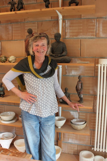 Un besoin de calme et d’ouverture a poussé cette Lausannoise à venir s’installer à la campagne pour trouver le silence. A 20 ans, elle posa ses valises à Mézières où elle résida 10 ans avant d’avoir l’opportunité d’acheter sa maison à Ferlens en 1998, située face à un magnifique panorama ouvert sur les Préalpes. Dans cet havre de paix, elle vit grandir ses trois filles et s’adonna à sa passion artistique. Après avoir effectué 4 ans de formation à l’Ecole supérieure d’arts appliqués en Céramique, à Vevey, elle a travaillé à Lausanne quelques années. Parallèlement, elle s’est impliquée dans la Fondation Delafontaine, qui œuvre dans le domaine du handicap mental de l’enfant à l’adulte, en offrant une pédagogie spécialisée. « J’y ai animé un atelier de poterie jusqu’à ma retraite, il y a 4 ans. Cela m’a énormément apporté. Ici, mon travail me donnait des idées et là-bas, je recherchais comment les développer avec les adolescents. Ces deux activités s’enrichissaient l’une avec l’autre. La terre est un élément thérapeutique en soi. Malaxer cette matière avec ces jeunes qui ont beaucoup de peine à s’enraciner leur aide à s’exprimer » relève l’artiste qui n’a cessé de se perfectionner avec des formations d’éducatrice sociale en cours d’emploi et d’animatrice en atelier d’expression.