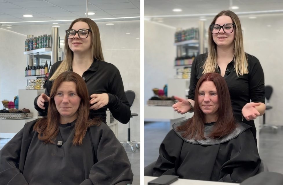 Voilà un peu plus de six mois, qu’elle a commencé sa formation. Sa maîtresse d’apprentissage a veillé à la responsabiliser très rapidement. Supervisée par une collègue, Maeva se lance avec une assurance dans toutes les tâches qui l’attendent pour prendre soin de Céline, sa maman. Brossage, conseils, teinture, rinçage, shampoing (…) brushing, jusqu’à lui demander, lors du face à face final, si elle est contente du résultat.