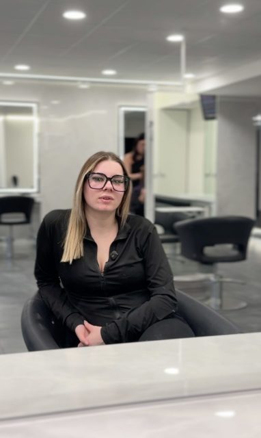 Sous son air doux, Maeva fait pourtant preuve d’une rigueur impressionnante. Chaque détail à son importance. Pour une coloration de précision, elle commence toujours par appliquer la teinte aux racines avant d’étendre le produit sur les longueurs, garantissant un rendu uniforme. Elle pense aussi au confort de ses client-e-s. Avant toute application, elle protège la peau avec un peu d’huile autour du visage, évitant ainsi les possibles irritations. C’est cette prévenance, à la fois technique et humaine, qui fait déjà d’elle une professionnelle prometteuse, attentive aux détails et à une expérience de qualité.