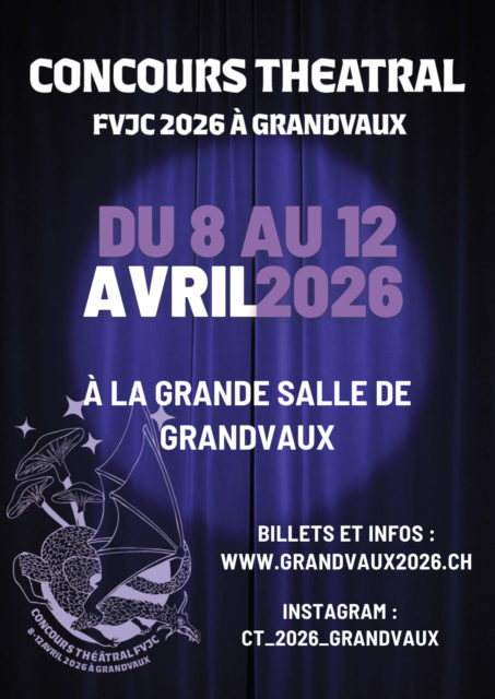 Théâtre, musique, magie, gourmandise, boissons et nourriture, tout cela vous attend au village de Grandvaux et à la grande salle, du 8 au 12 avril. Rendez-vous sur www.grandvaux2026.ch pour le programme complet et la billetterie, ainsi que sur instagram sous ct_2026_grandvaux. On se réjouit de vous accueillir !