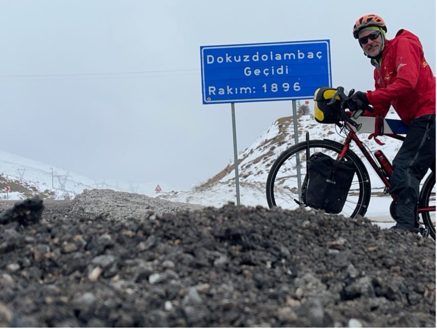 En Turquie, les petites routes prennent souvent des airs de pistes très peu praticables à vélo. Après une belle journée de ski sur le domaine d’Ulludag, au-dessus de la ville de Bursa où, de passage 25 ans plus tôt, « je m’y étais juré d’y revenir une fois pour skier », il s’offre un trajet en bus pour parcourir en une nuit ce qui lui aurait pris une semaine en vélo. L’objectif de ce léger détour est d’aller skier et randonner au pied du Mont Erciyes, un spectaculaire volcan de 3916 mètres. Dans les plaines d’Anatolie, situées à 1500 mètres d’altitude, tout est blanc et c’est splendide.