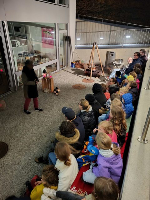 Les bénévoles de la bibliothèque du Jorat sont aux commandes une fois de plus avec enthousiasme. La préparation dûment orchestrée, les informations sont données à un public de septante jeunes enfants avec plusieurs accompagnants. Quatre groupes vont passer d’un lieu à l’autre pour écouter et vivre un conte différent. Pour les lieux intérieurs, on se dirige vers la bibliothèque et la salle de musique du collège du Raffort et vers deux lieux extérieurs, soit dans la cour de récréations ! Météo clémente excepté le foehn qui jouait des tours aux bénévoles s’efforçant en vain de garder les photophores allumés…