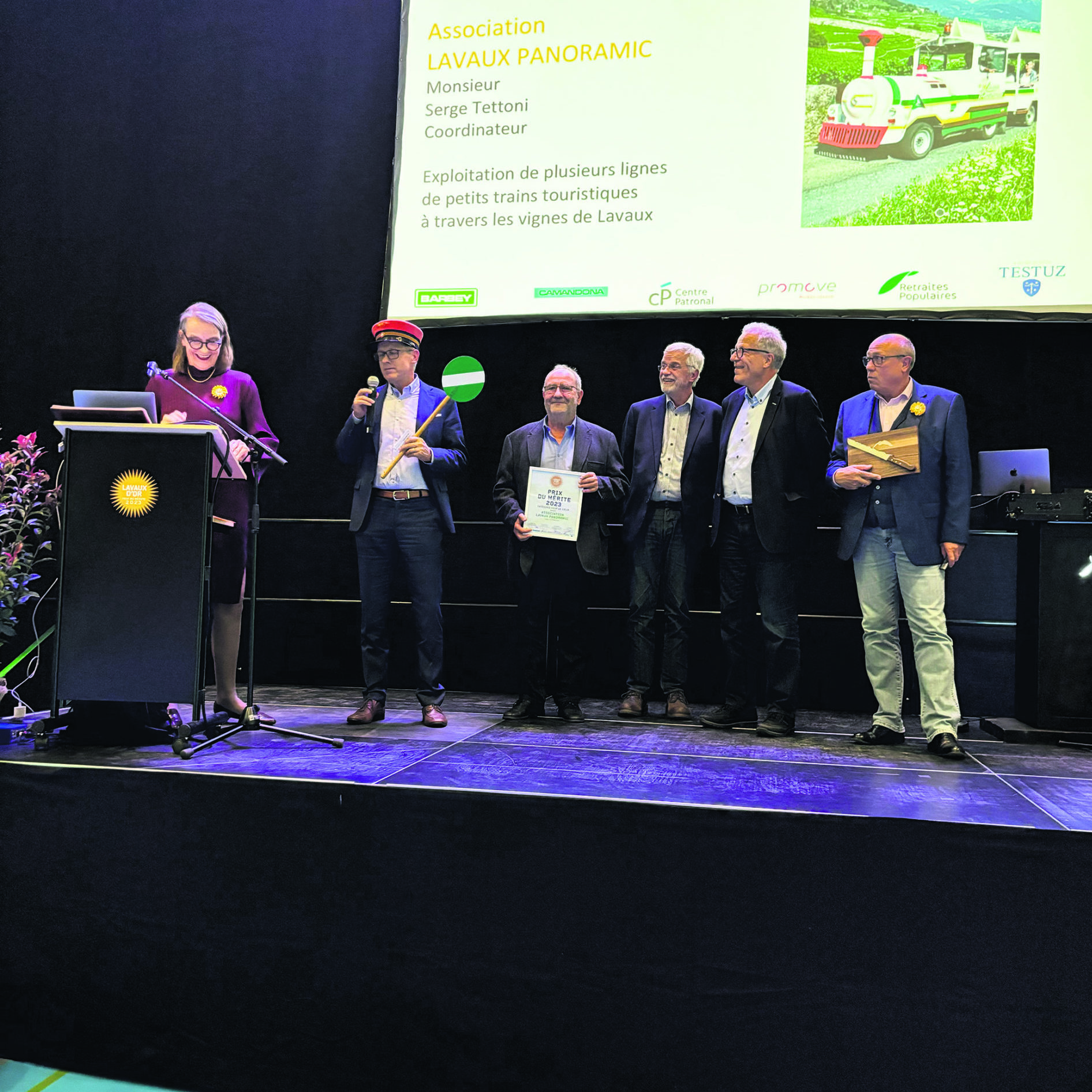 Dans la catégorie COUP DE CŒUR, c’est l’Association du Lavaux Panoramic pour l’exploitation de plusieurs lignes de petits trains touristiques à travers les vignes de Lavaux qui a été primée. Le coordinateur, Serge Tettoni, s’était coiffé de la casquette du chef de train avec en main la palette du feu vert pour recevoir ce prix qui permettra au Lavaux Panoramic de viser encore d’autres projets touristiques.
