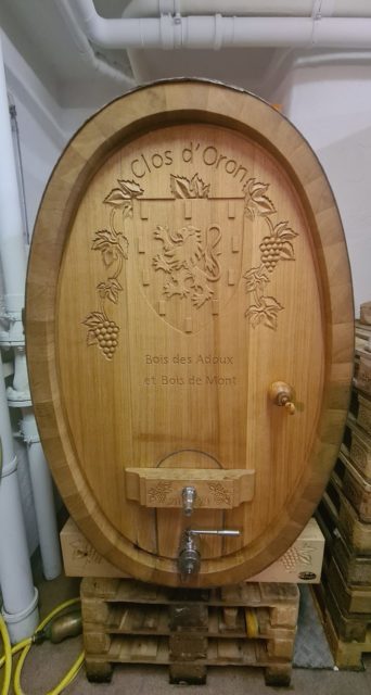 En pénétrant dans la cave, en compagnie du municipal d’Oron en charge des vignes, conduit par le jeune professionnel, nous passons devant l’imposant foudre de chêne magnifiquement décoré, issu des forêts communales. « Nous avons fait l’essai d’élever du blanc dans ce tonneau, mais nous allons y mettre du rouge » confie l’élu. Devant les cuves rutilantes et dûment étiquetées, nous apprenons que la récolte a été légèrement inférieure aux années précédentes, un constat partagé par les autres vignerons. Cette année sera considérée comme standard avec un taux de 76o Oechslé, pour le blanc, ce qui est largement au-delà du minimum pour une appellation « Grand Cru ». Le rouge a présenté une belle maturité, du sucre et une belle peau.