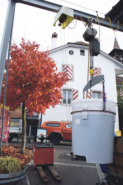 En cette journée d’automne, on s’active à Aran pour presser les derniers rouges. En effet, ils ont macéré environ 25 jours (dans le cas du Merlot). « Le but de la macération est d’extraire l’aromatique et les tanins. On a remarqué que les cépages tardifs qui donnent de la puissance et du corps ont un meilleur potentiel de garde », explique Sébastien Dance.