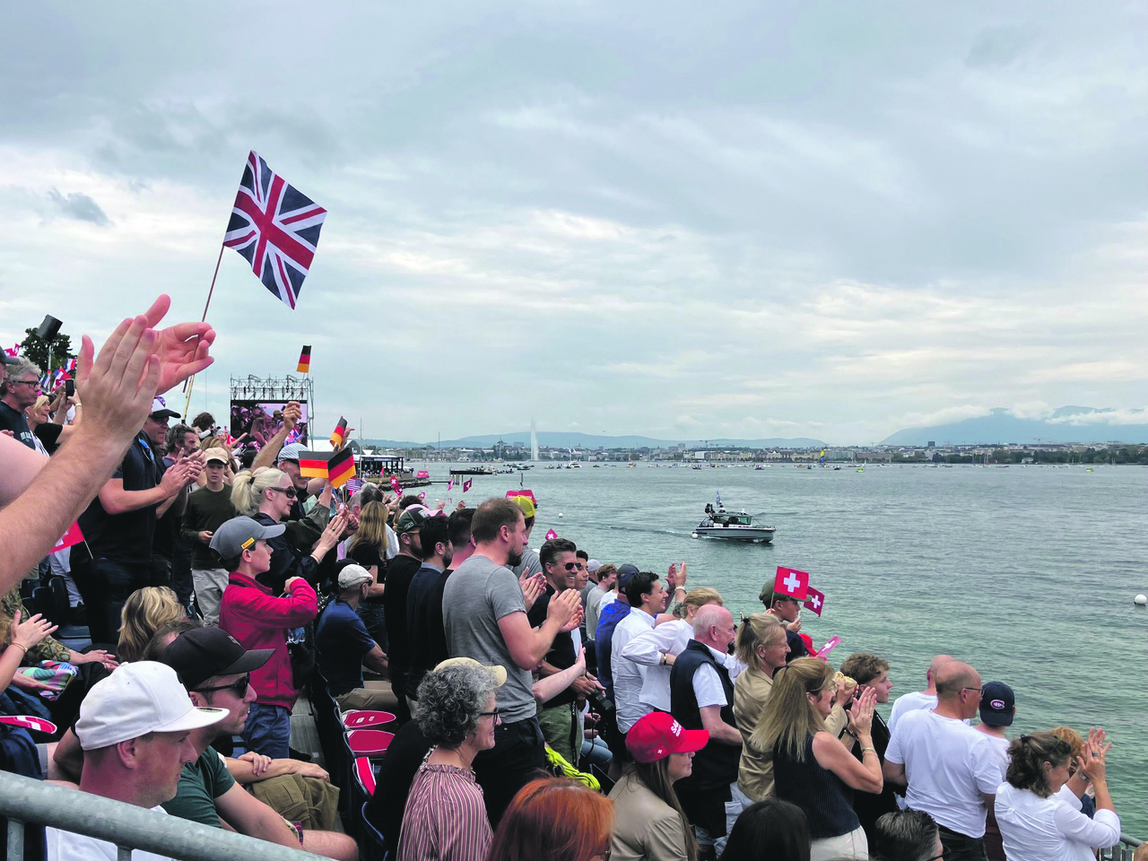 Chacune des douze courses du circuit se déroule sur de petits bords, rendant spectaculaire chaque manche et permettant d’en envoyer une nouvelle sitôt la précédente terminée. A notre arrivée, dimanche pour la 10e manche du circuit à Genève, pas de jet d’eau ! C’est que les douze voiliers, avant et après les courses, se trouvent dessous. Le Brésil n’a pas concouru, touchant une bouée qui rendait impossible sa participation. S’il y avait peu de vent samedi, les conditions de dimanche étaient changeantes. Faible pour la course 4, retardée et réorientée à la course 5 sous l’effet d’un joran bienvenu.